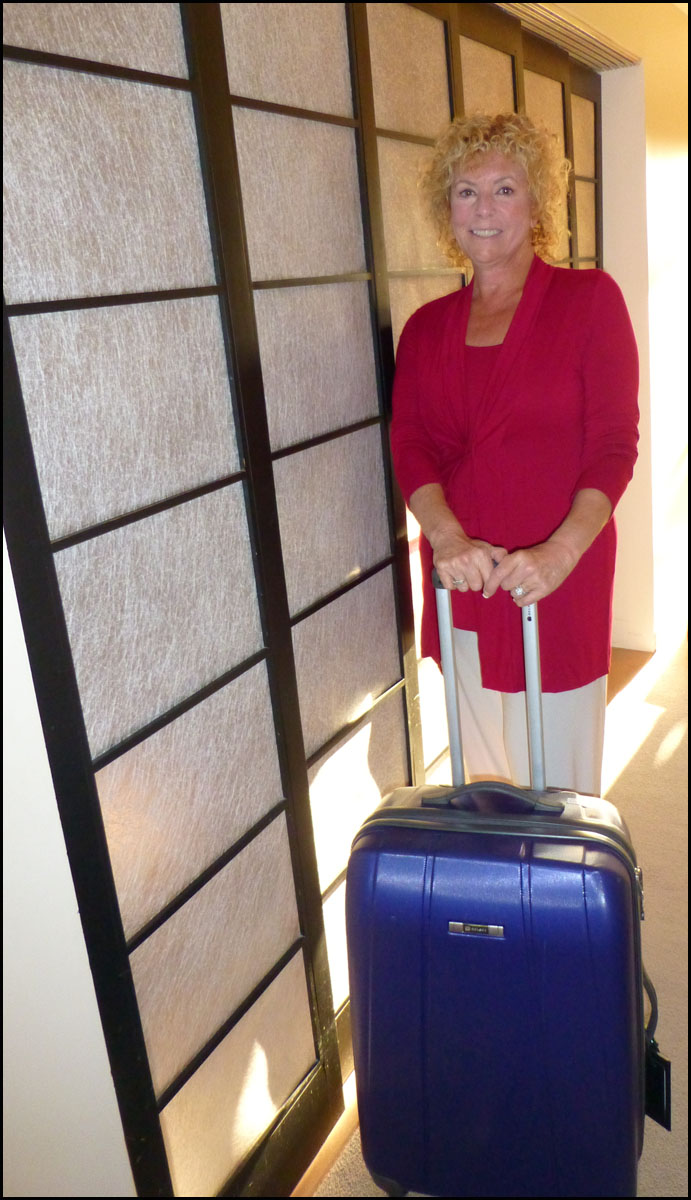 Meanwhile, I packed up my 25-inch hardside Delsey (pictured at right), superlight and cute, to go East for a week. And with my necessary stuff inside, it weighed 47 pounds, very close to the international limit of 50. Gosh, if that’s what the medium weighs, how much will the large weigh? I shudder.