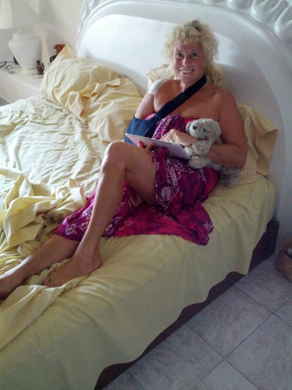 I am a caged animal, strapped into a hot, sweaty sling, with a healing wound on my shoulder. It’s too hot to sit outside when a girl can’t swim, and I’m too cheap to sit inside in the air-conditioning for long. So I pace back and forth. I bead, and read, and pace again. I’m eager to go somewhere and don’t feel like it either.